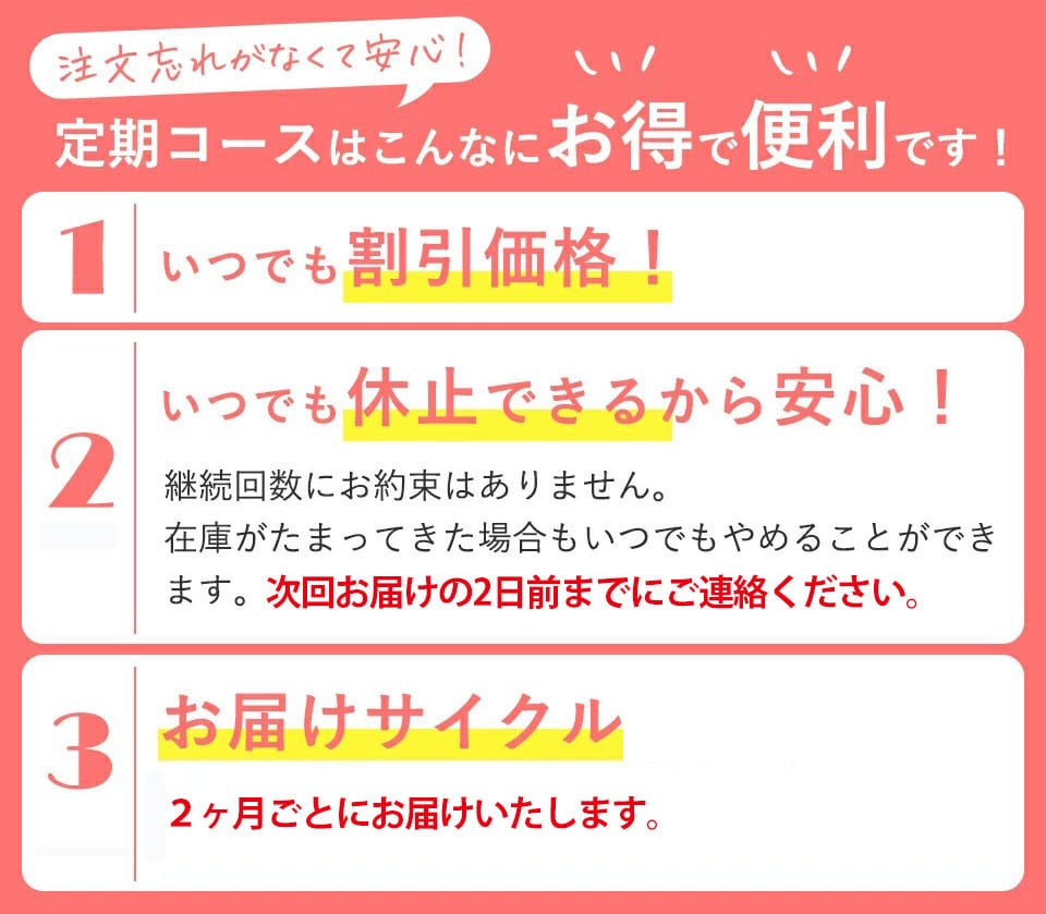 ・販売サイクル:2ヶ月ごとお届けする定期コースです。